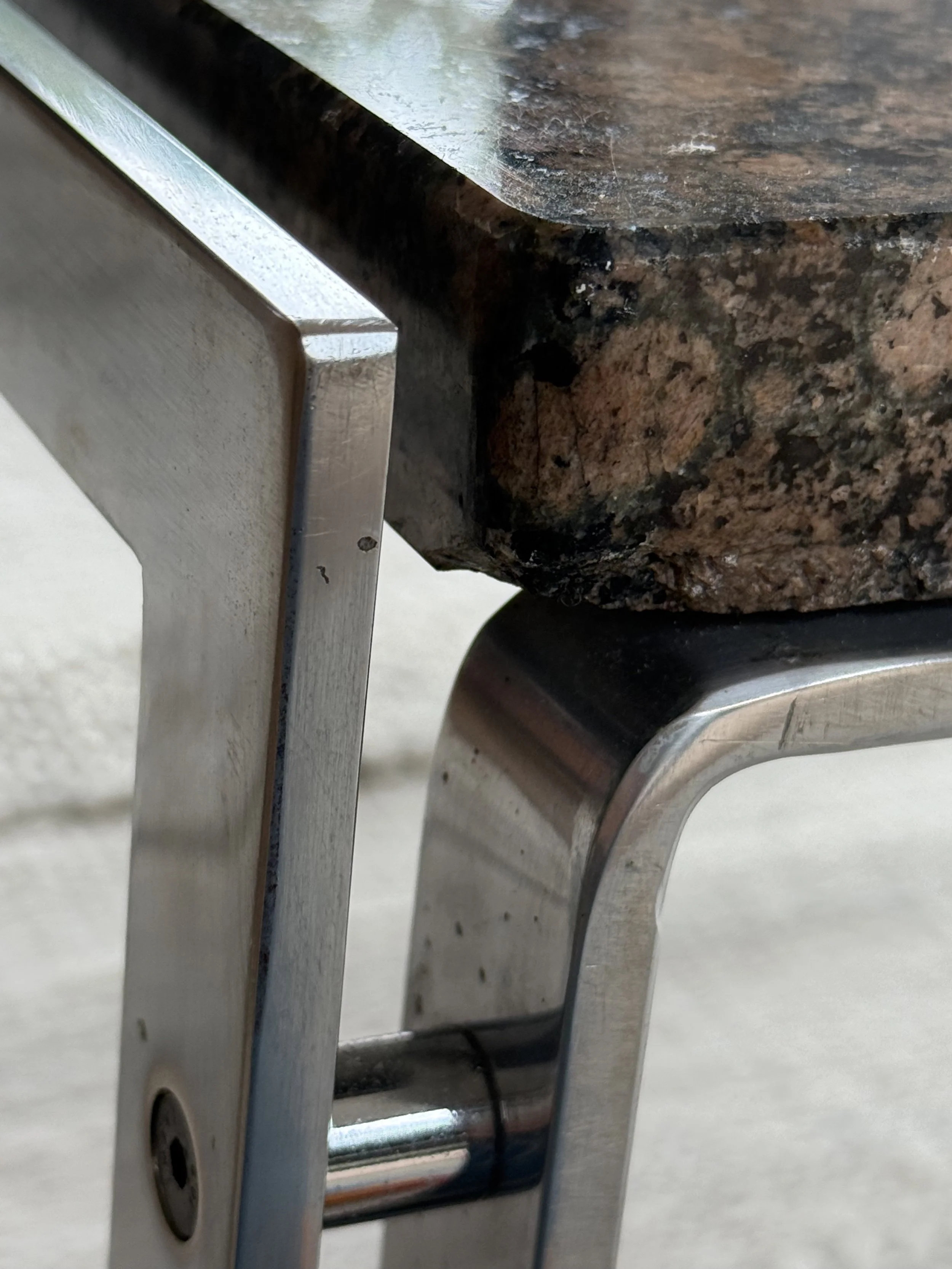 The table features a heavy, natural granite top with a beautiful matte texture, providing a sophisticated contrast to the industrial rigidity of the base. The frame is constructed from high-grade flat-bar chrome, showcasing the architectural "floating top" aesthetic that Brüning is celebrated for. With its clean lines and substantial presence, this piece effortlessly bridges the gap between mid-century warmth and contemporary brutalism.