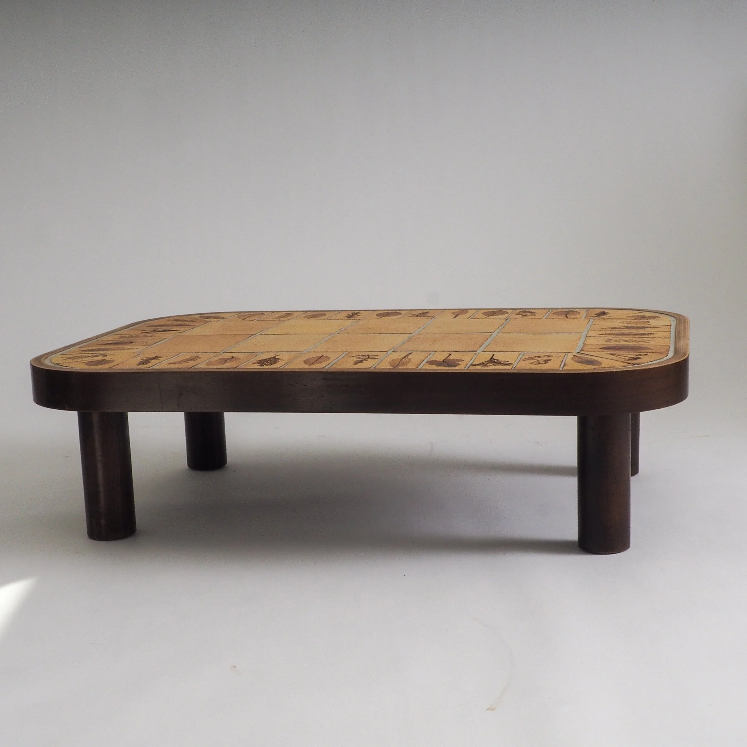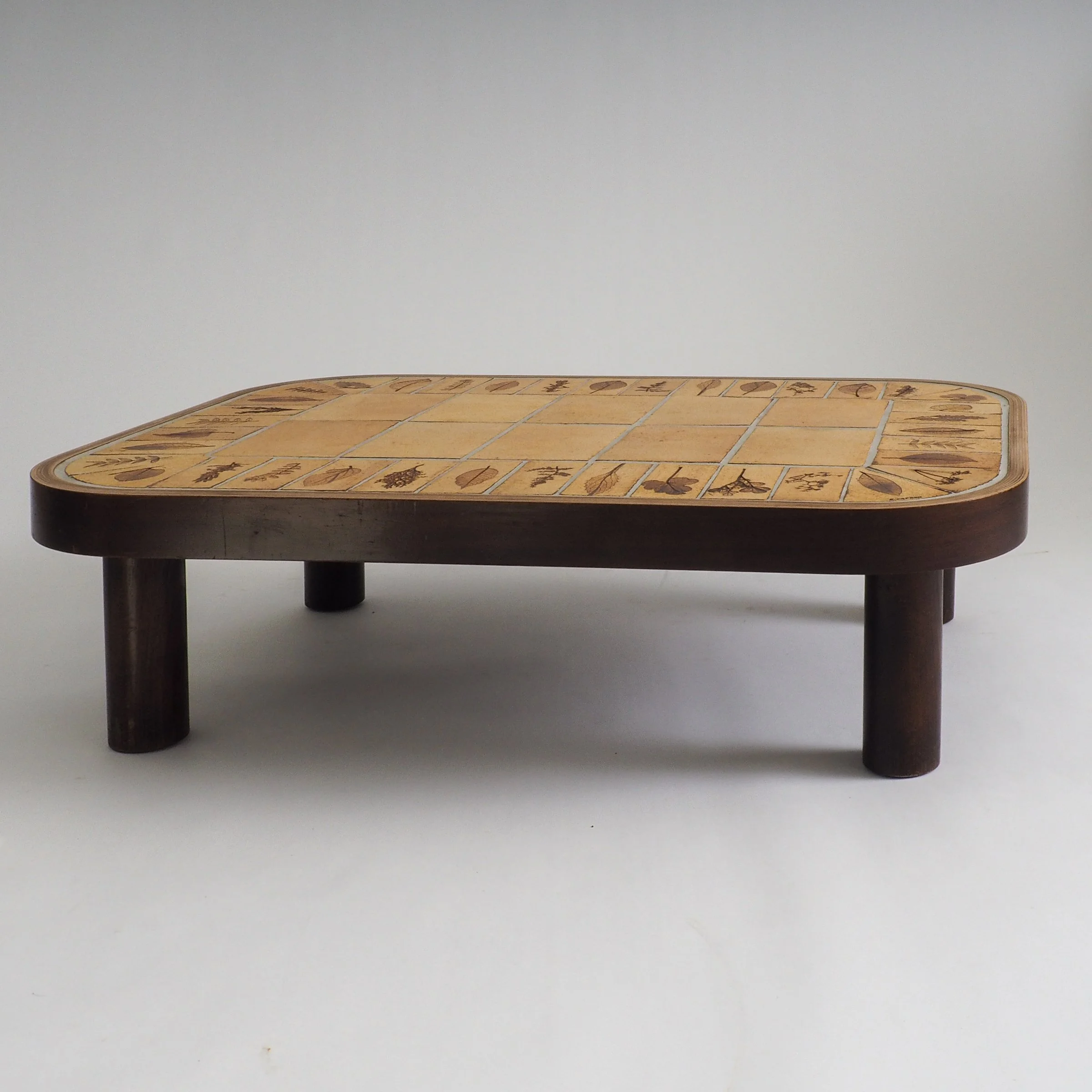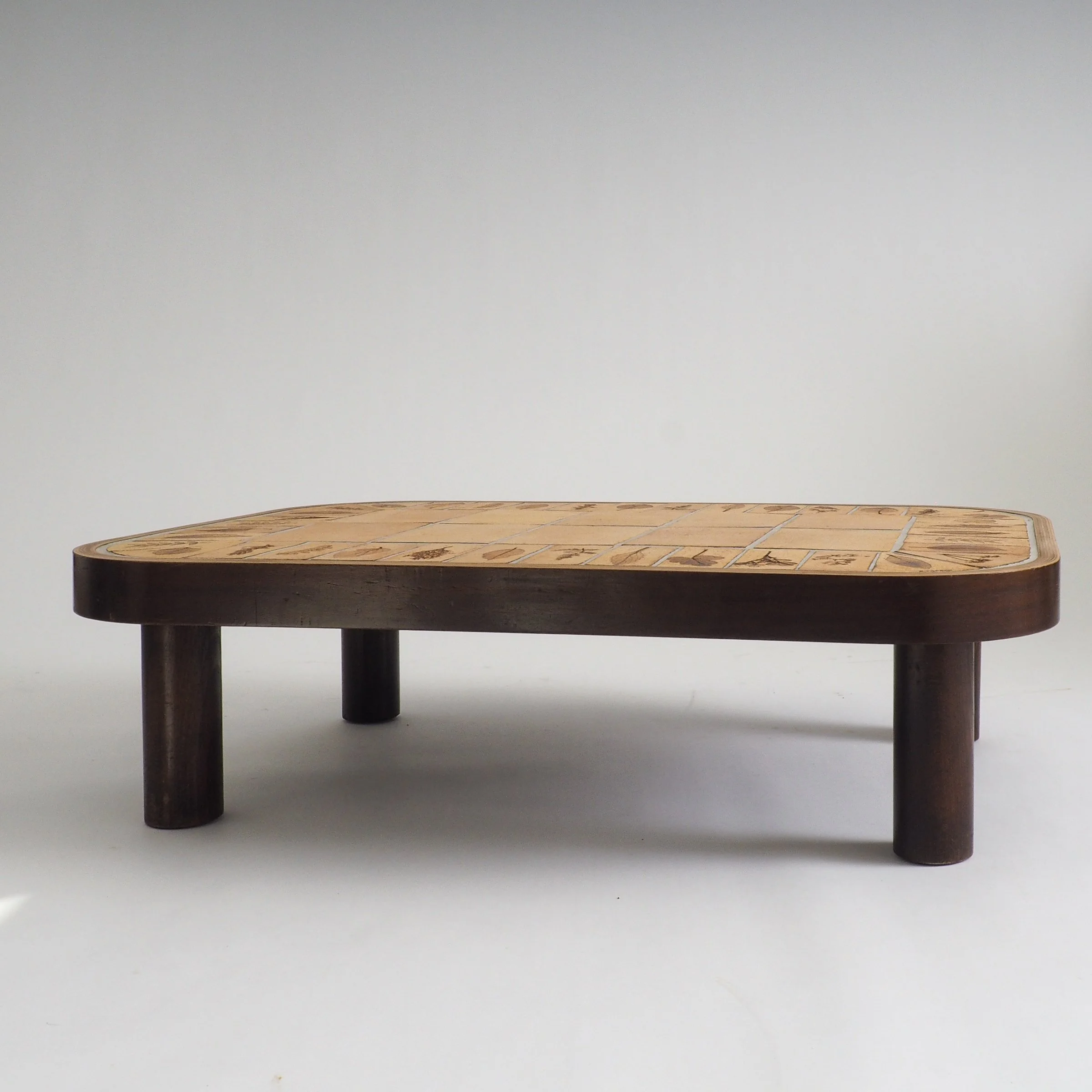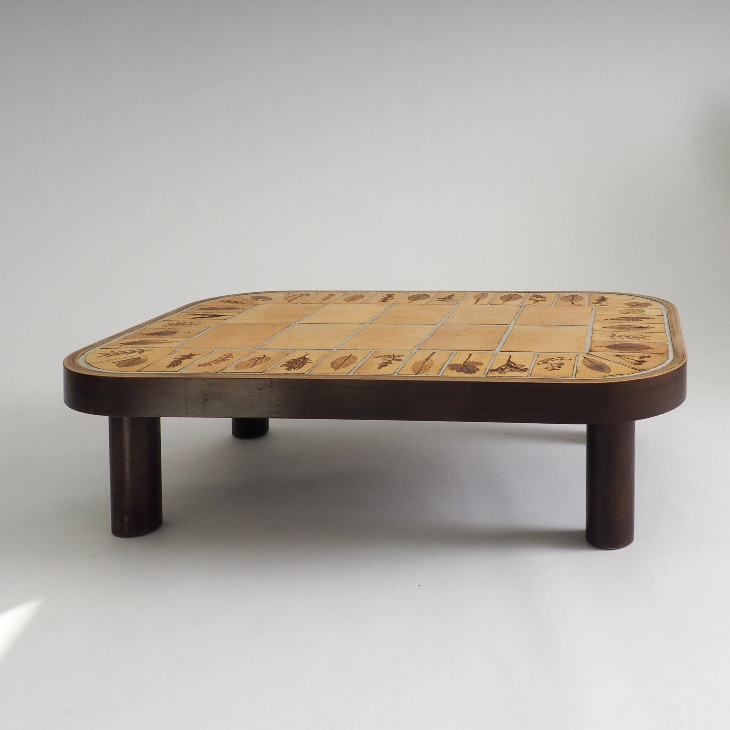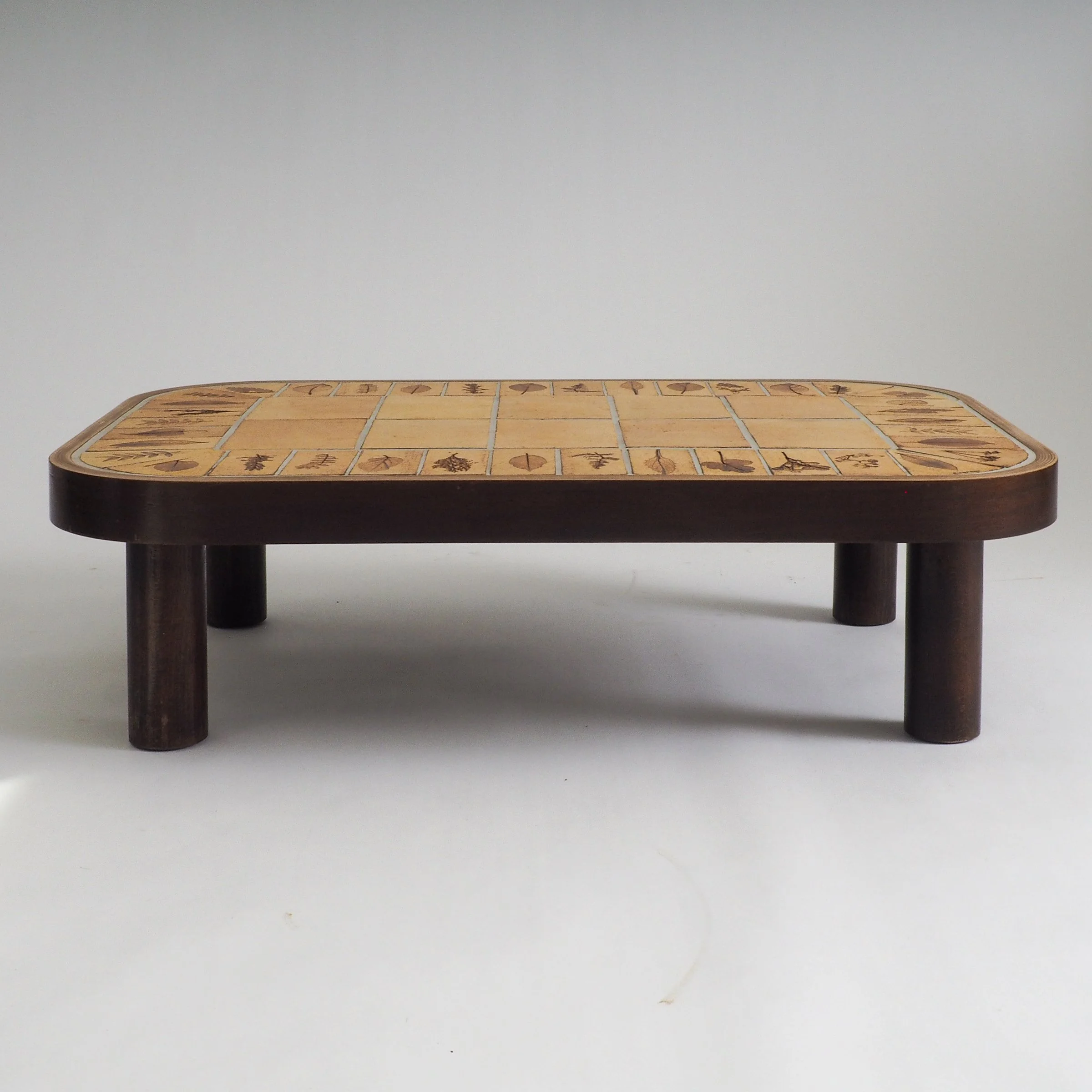 Own a piece of French design history with this authentic coffee table by the renowned master ceramicist Roger Capron. Created in his famous studio in Vallauris, France, during the 1960s, this table is part of his iconic "Garrigue" series. The tabletop is composed of handcrafted tiles inlaid with actual leaves and wildflowers from the South of France, which were pressed into the clay and burned away during firing to leave behind these delicate, fossil-like impressions.