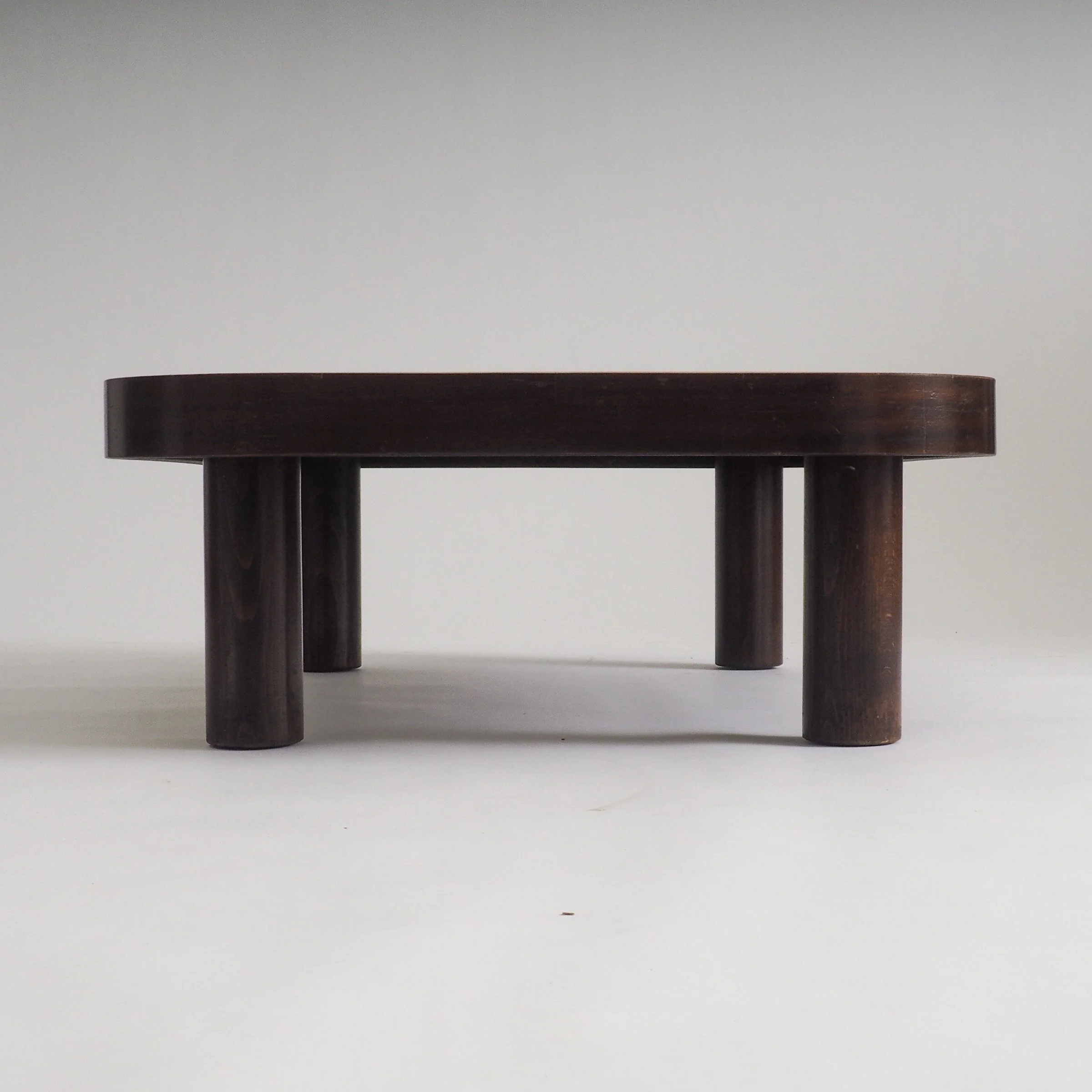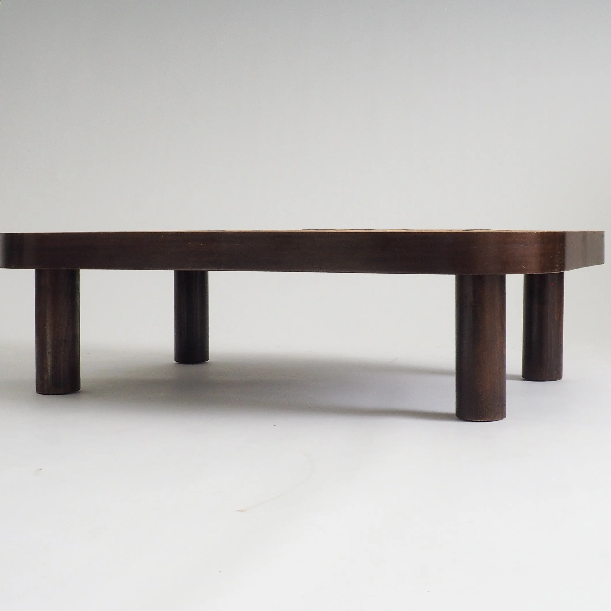 The warm, earthy tones of the stoneware are beautifully framed by a dark-stained wood base with rounded corners and substantial cylindrical legs. This "Brutalist" silhouette perfectly complements the organic, botanical details of the tiles.